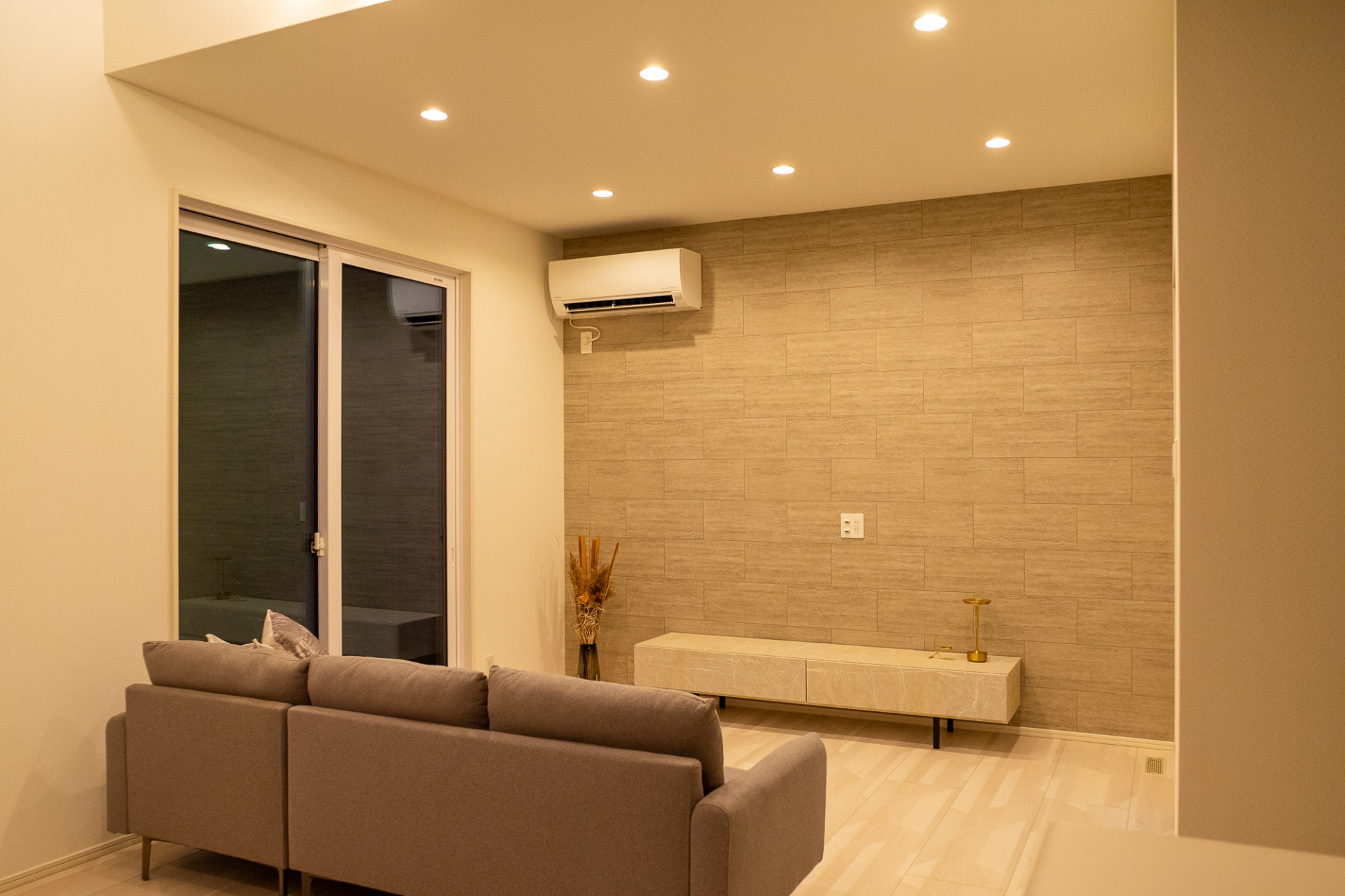 高窓から差し込む自然光がリビング善意を明るく包み込み、昼間は照明に頼らずとも快適に過ごせます。さらに、天井に設置されたシーリングファンが空気を循環させ、夏も冬も心地よい室内環境を保ちます。