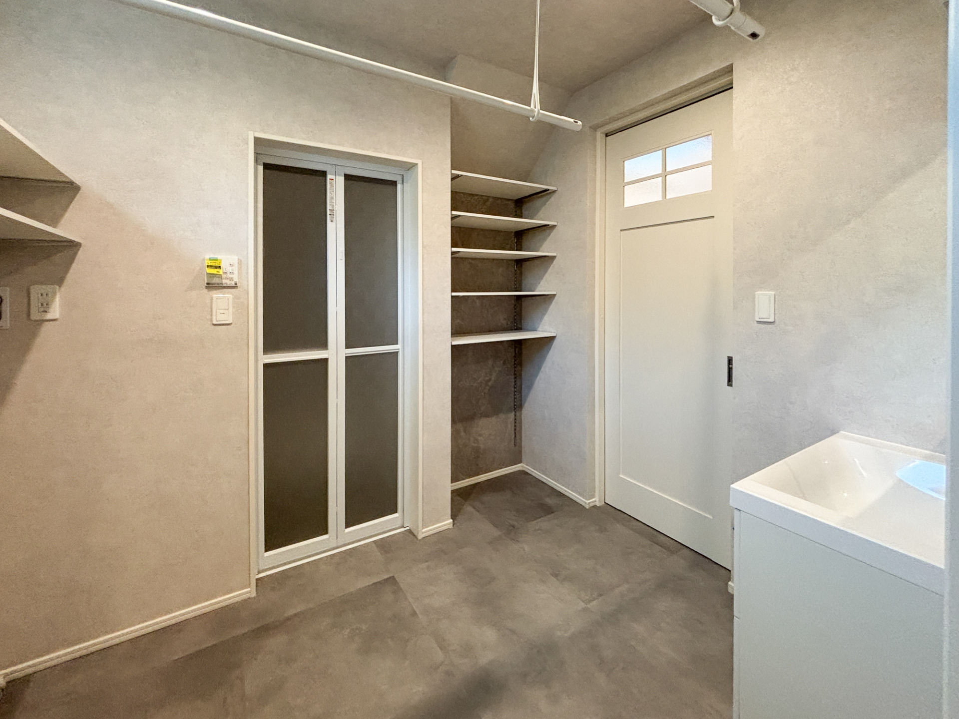 洗濯機・室内物干し・収納棚がすべてそろった家事ラク動線のランドリールーム。
