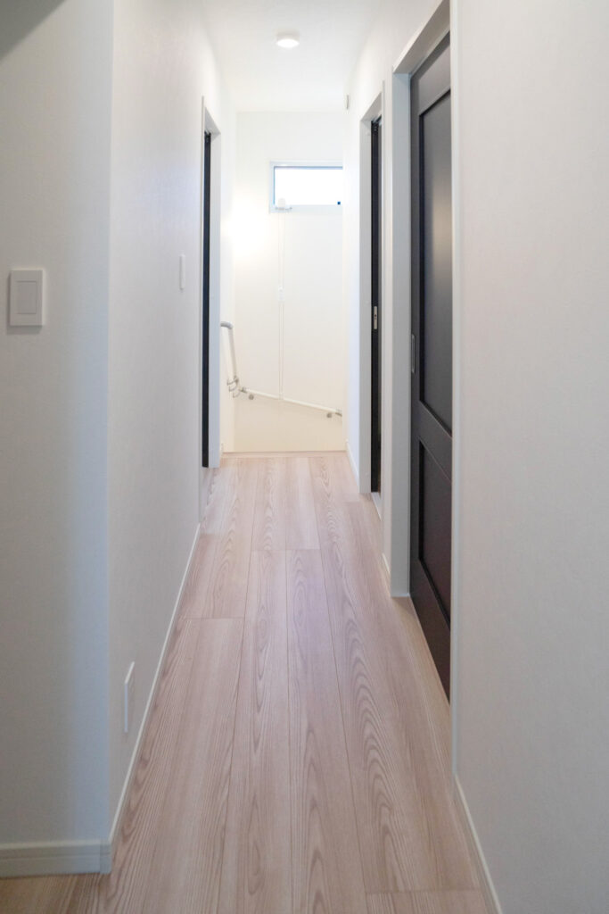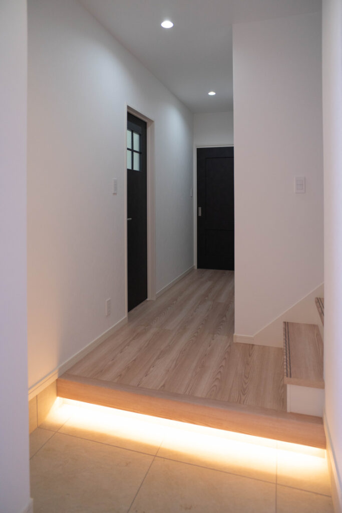 足元の間接照明が帰宅した瞬間にほっとする雰囲気を演出。廊下も落ち着いた色合いで住む人訪れる人も心地よく迎えいれます。