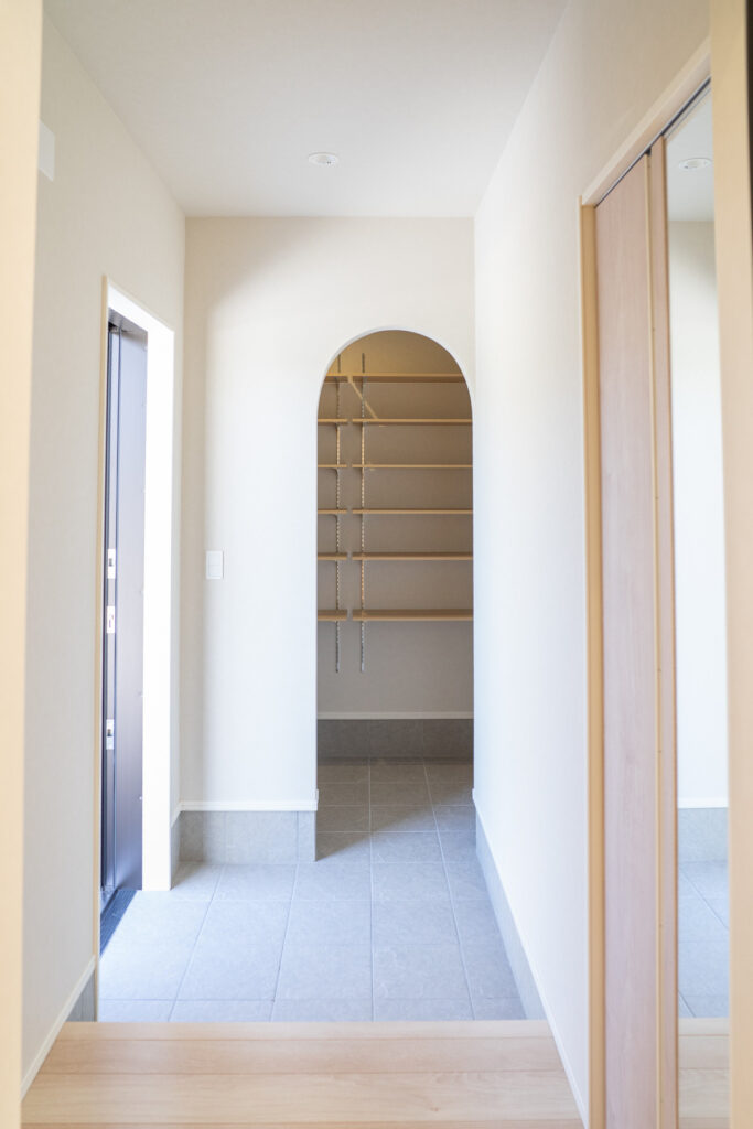 靴やアウトドア用品、日用品のストックまでしっかり収まる土間収納。